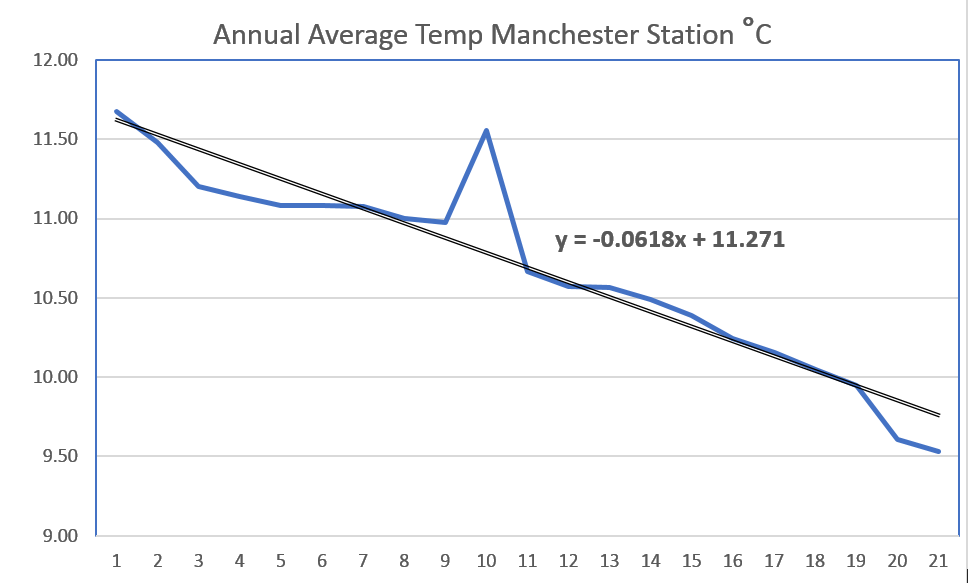One of my longer-lived Wunderground stations is in Manchester and despite Global Warming, Climate Change and the Urban Island Effect, the temperature there is in free-fall