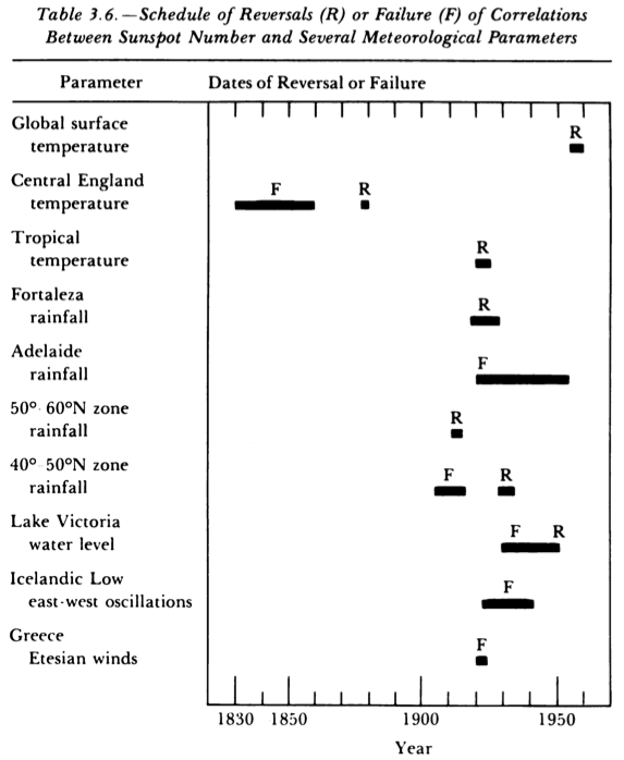 George Siscoe optimistically reviewed the 1970s golden decade of sun-climate research (Siscoe 1978), citing three major advances. Those of Wilcox and Eddy, and the studies linking drought in the North American Southwest to the 22-yr Hale solar magnetic cycle. But while the sun-climate subfield was again bursting with activity, advanced with well attended meetings, given its interdisciplinary and controversial nature, it was still criticized. Barrie Pittock published a critical look at 140 sun-climate articles (Pittock 1978) and concluded “that despite a massive literature on the subject, there is at present little or no convincing evidence of statistically significant or practically useful correlations between sunspot cycles and the weather or climate.”