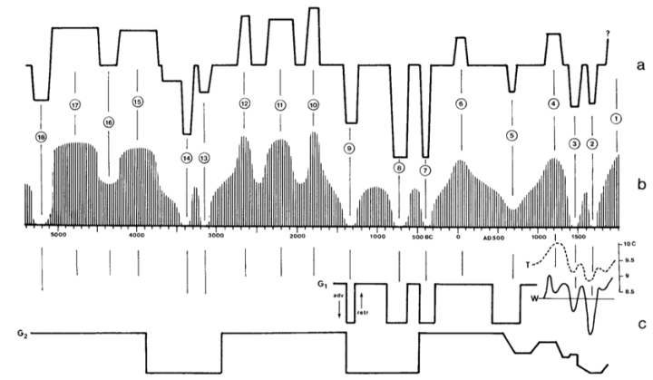 This finding opened the door to using the recently reconstructed 14C changes to study solar variability and its relationship to climatic changes in the distant past. Starting in 1963, and based on his glaciological and botanical studies, Roger Bray proposed that there was a close relation between solar activity and climate during the past centuries and millennia. In 1968 he identified the solar and climate 2500-year cycle that has been recently named after him (Vinós 2016). This long solar cycle is the most important, in terms of climatic effect, during the Holocene. The most recent low in Bray’s solar cycle, during 1388–1834 (Bray 1968), coincides with the Little Ice Age (LIA) discovered by François Matthes in 1939. Roger Bray was the first to propose that the LIA had a solar cause. During the 1960s and 1970s Roger Bray published 14 articles in Nature and Science linking solar variability and volcanic activity to climate change, but since he was a botanist researching climate independently from New Zealand and removed from other sun-climate scientists, he was unjustly not credited for his findings. His cycle was given the absurd “Hallstatt” name by Paul Damon and Charles Sonnet (Damon & Sonnet 1991), despite their being aware of Bray’s work.