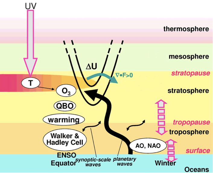 In Fig. 1.8 solar UV radiation acts on the ozone layer in the stratosphere increasing its temperature (T) and the amount of ozone (O3). The change in temperature alters the latitudinal temperature gradient, and through thermal wind balance affects the zonal-mean zonal winds (ΔU). The change in zonal winds alters the properties of the atmosphere for propagating planetary waves. The effect creates an anomalous divergence (>0) of the Eliassen-Palm flux (F) proportional to the eddy potential vorticity, changing the deposition of momentum and kinetic energy. The strength of the polar vortex (not shown) depends on those changes, driving changes in the Arctic Oscillation (AO), North Atlantic Oscillation (NAO), and the Hadley and Walker circulations. Thick interrupted arrows indicate coupling. The figure is after Gray et al. 2010.