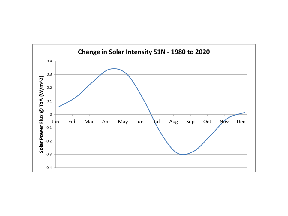 Attached shows variation in ToA solar intensity at 51N over the past 40 years.