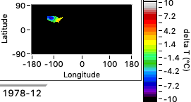 After the 1980 subtraction, I then plotted an intensity map using one pixel per grid location, for a total of 72×144 locations. This showed how any given month varied from 1980, which only rarely exceeded ±10°C. I also made histograms for each month, and then assembled them into an animated GIF, see here.