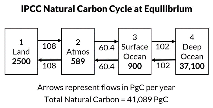 Figure 1 shows IPCC’s natural carbon cycle at equilibrium with atmospheric CO2 at 280 ppm (589 PgC). The boxes show reservoirs and arrows the flows between reservoirs.
