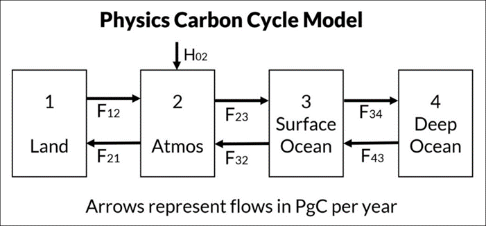 Figure 2 shows the physics carbon cycle model with IPCC’s four reservoirs and six outflows, where the arrows are all positive numbers.