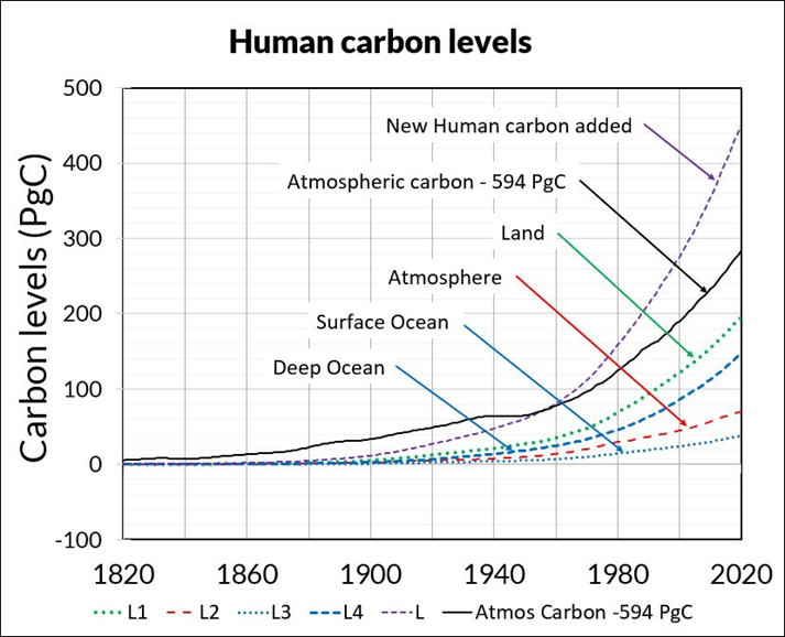 Figure 2. The human carbon cycle model uses the same physics as IPCC’s natural carbon cycle but adds the annual inflow of human carbon.