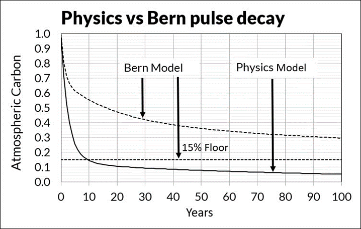 The key difference between the Bern model and the physics model is the Bern model uses IPCC’s invalid assumption that human CO2 causes all the CO2 increase while the physics model uses IPCC’s e-time of 3.5 years.