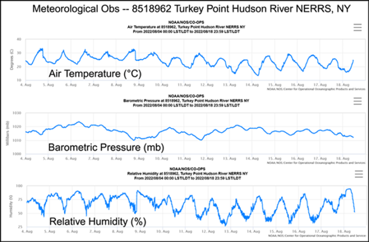 Let’s try to see why it isn’t calculated and used even though the calculator on your smartphone is powerful enough to do the math. Here are the meteorological observations from a CO-OPS weather station, chosen because it reports Temperature, Barometric Pressure (air pressure) and Relative Humidity (not all stations do so or have the information publicly available). Note that this particular weather station is right on the waterfront – literally just meters from the river’s edge.