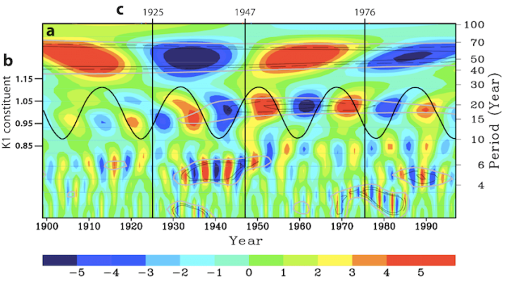 In Fig. 4.2, the central graph (a) is the wavelet-transform coefficient of the winter North Pacific index as the area-averaged sea-level pressure anomaly (hPa) in the region 160°E−140°W, 30−65°N. It is a three-dimensional representation of the time domain (1899–1997, X-axis), the frequency domain (periodicity, Y-axis), and the amplitude of the changes (color scale, hPa) of the pressure changes in a region centered in the Aleutian Low. Blue color indicates a deeper Aleutian Low associated with PDO positive phases. The thin black-solid, black-dashed and grey contours indicate the significance at the 95, 90 and 80 % confidence levels, respectively. The plot is from Minobe 1999. The thick black line, left scale, (b) is the phase and amplitude sine wave of the diurnal lunar nodal cycle K1 tidal constituent. It has been overlain to show that both the phase and period of the bidecadal component in the instrumental record is that of the 18.6-year lunar nodal cycle. The sine wave is after McKinnell and Crawford (2007). The dates of Pacific climate regime shifts (c) are shown as vertical lines, as identified by Mantua et al. (1997).