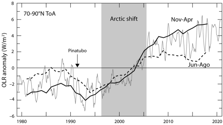 In Fig. 4.7 the thin grey line is the 7-month average of the monthly mean OLR anomaly in W/m2 from the interpolated OLR NOAA dataset. The thick black line is the 5-year average of the cold season (Nov–Apr) mean. The thick black dashed line is the 5-year average of the summer (JJA) mean. The grey box highlights the Arctic shift in OLR between mid-1996 and late 2005. The time of the Pinatubo eruption is identified. Data from KNMI explorer. The illustration is from Vinós 2022.