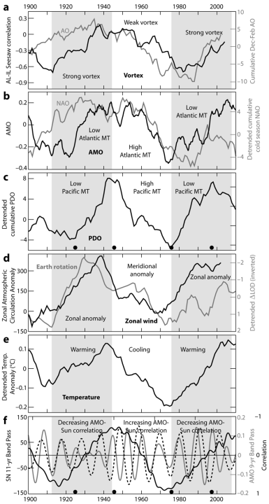 The black line in panel (d) shows the zonal atmospheric circulation index, cumulative anomaly. It is after Klyashtorin & Lyubushin 2007. The grey line in panel (d) is the 1900–2020 inverted and detrended annual ∆LOD. The data is in milliseconds from IERS. Panel (e) is the detrended 1895–2015 annual global surface average temperature, 10-year averaged. The data are from Met Office HadCRUT 4.6. The panel (f) dashed line is the 8.2–16.6-year band-pass of the monthly mean total sunspot number. The data are from WDC–SILSO. The grey line is the 6.6–11-year band-pass of the monthly AMO index. The black line is the inverted 20-year running correlation of the band-pass sunspot and AMO data. The black dots indicate climate shifts, as in c, showing their position with respect to solar minima. The illustration is from Vinós 2022.