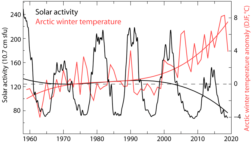 ” The negative correlation between long-term solar activity and Arctic winter temperature is clear (Fig. 5.5).