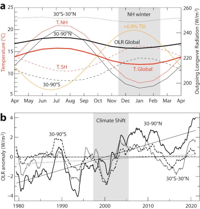 There are very important differences between the hemispheres regarding climate energy and transport. As figure 6.3a shows, outside the tropics OLR essentially follows temperature. Within the tropics OLR and temperature show inverse correlation, as higher temperature leads to increased cloud cover and less emission. According to the modern theory of climate change the increase in GHGs results in the same IR emission to space taking place from a higher, colder altitude, requiring surface warming to maintain the energy balance. The Earth must emit the same energy it receives, not more, unless it is cooling. Under this model inter-annual OLR from the TOA should not change unless there is a change in incoming solar energy or in albedo.