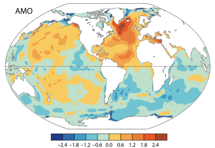 Fig. 6.6 displays the °C of SST change per °C of AMO index. Besides displaying the AMO pattern, it shows that AMO is linked to the global surface MT system that extracts heat from the tropics in the main ocean basins. Figure 6.6 is after Deser et al. 2010.