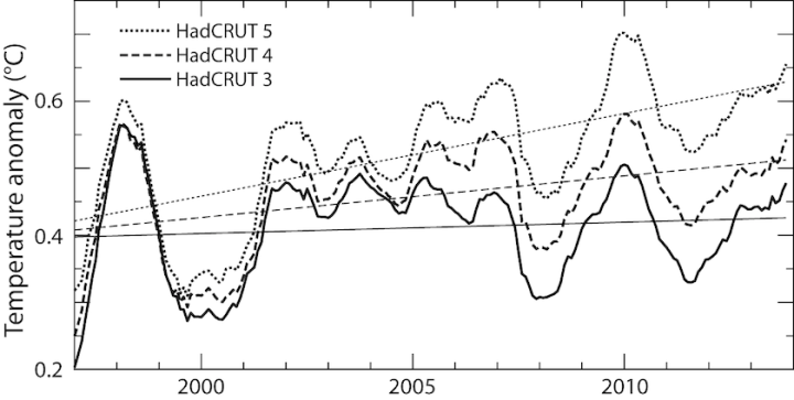 As an example, Fig. 6.9 shows three different releases of the Met Office Hadley Centre global surface temperature datasets over the past 10 years (HadCRUT 3, 4 & 5) for the period 1997-2014 (13-month averaged). While HadCRUT 3 showed no increasing trend, each iteration displayed a bigger trend, and the changes have resulted in almost 0.2 °C of additional warming in just 17 years from the same raw data. It gives a new meaning to anthropogenic warming. At the end of that period the older datasets are outside the confidence limits of the newest and, therefore, no confidence can be placed on those limits. We don’t know how much the planet has warmed even over such a short modern period, much less over the past century.