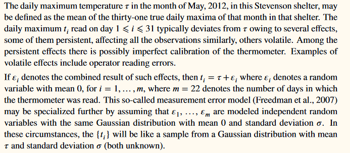 In that example, the maximum temperature (TMAX) was recorded for 22 non-consecutive days of May 2012. The average TMAX for the month was calculated, as were the standard deviation s and the standard uncertainty associated with the average, sem. The values were 25.6C , 4.1C, and 0.782C.