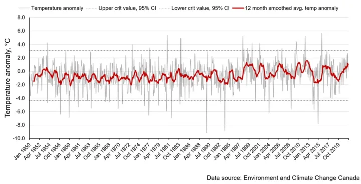 There’s a couple of common themes to all 4 of these above regions. First, the long-term trend in the temperature anomaly has stayed remarkably consistent over the past 70 years. Second, in virtually all of the cases where the measured temperature anomaly falls outside the 95% confidence interval, it is during the months of December through February. In other words, spring, summer and fall in Canada have stayed remarkably stable over the past 70 years. Cooling or warming trends therefore seem to ultimately be the result of unusually cold or warm months during the winter. On this basis, I would argue that the claim that Canada is experiencing unprecedented warming is not supported by historical climate data. In fact, it isn’t even clear that there is any significant warming at all.