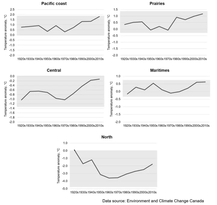 Figure 6. Decadal trend in temperature anomaly (°C) in each Canadian region northern territories relative to the 1890-1919 reference period, 1920-2019. Shaded area represents the historical 95% confidence interval for the temperature anomaly measurement.