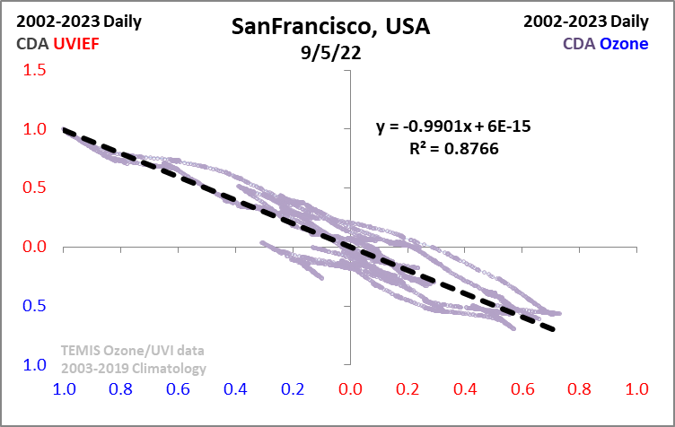 Scatterplot of the San Francisco UVI CDA vs Ozone CDA shows inverse relationship: