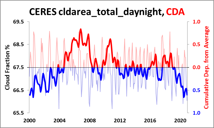 Here you go Willis, total cloud area with it’s cumulative departure from average curve (CDA).