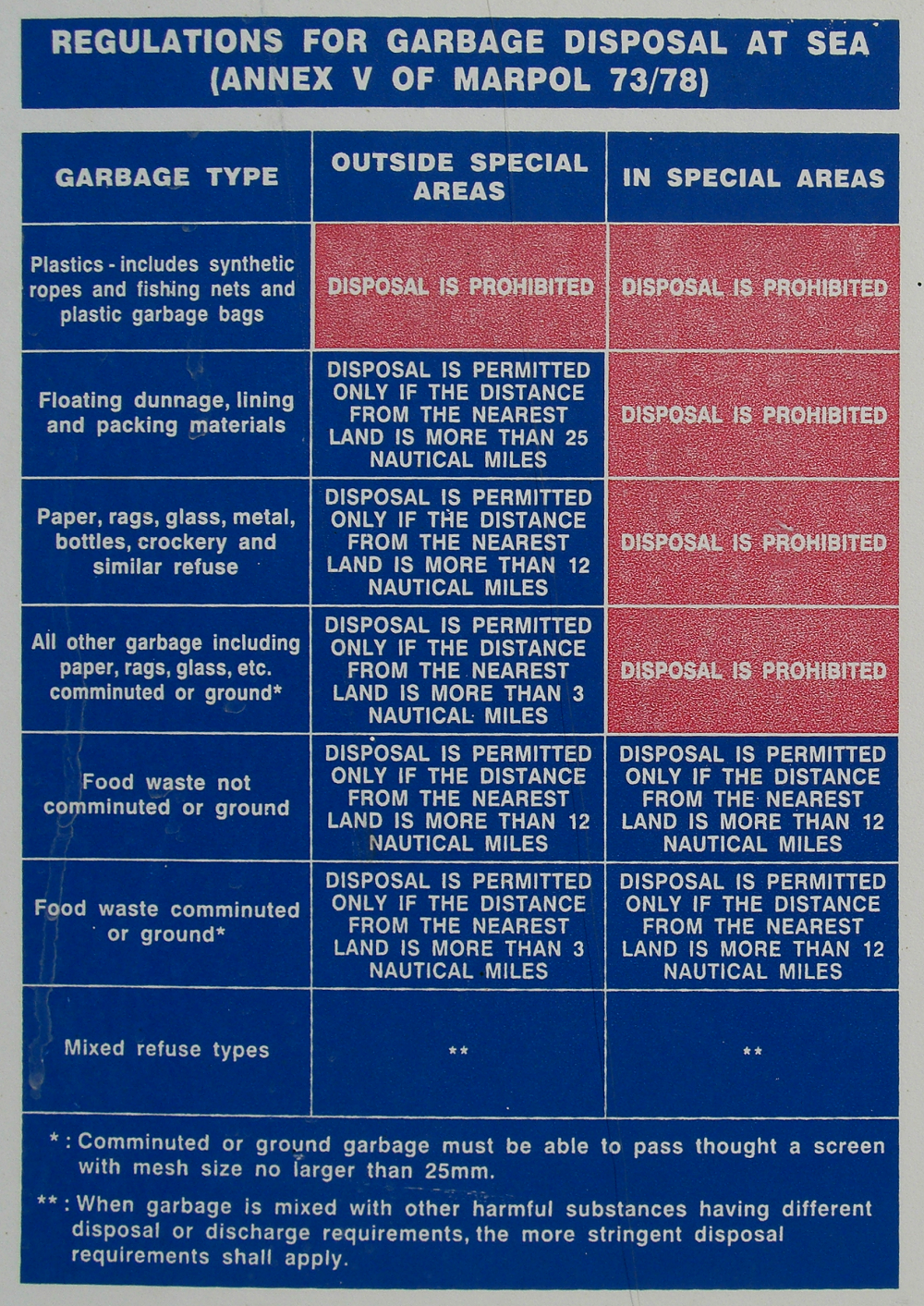 Since the late-1970s, all ships are required to post signage clearly laying out the requirements for disposal of trash and garbage at sea under international MARPOL treaties. Captains and owners are required to enforce these rules and can be held personally responsible for violations of them by their ship’s crew. Since 1988, MARPOL Annex V completely bans the dumping plastic into the ocean.