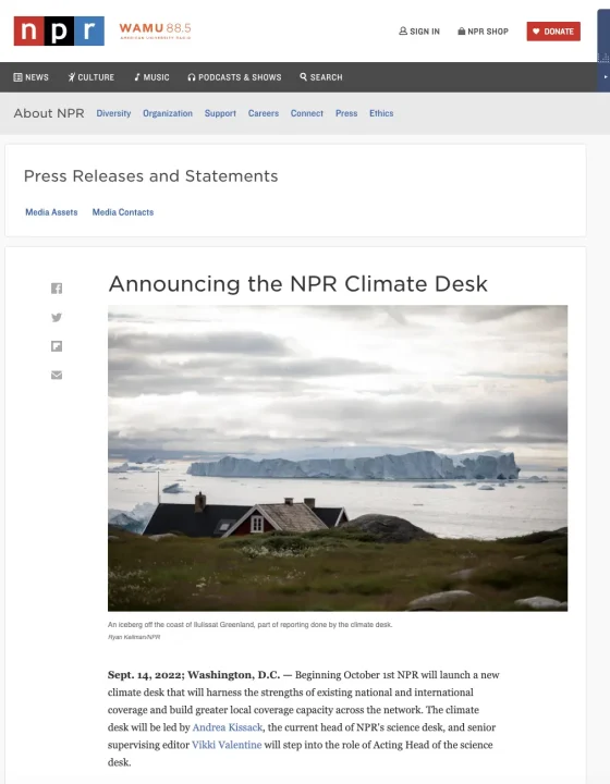 Sept. 14, 2022; Washington, D.C. — Beginning October 1st NPR will launch a new climate desk that will harness the strengths of existing national and international coverage and build greater local coverage capacity across the network. …”Climate might be the most important story of our time and we need a dedicated team of journalists to cover it and work across desks in our newsroom and with our international bureaus,” said NPR’s SVP of News and Editorial Director Nancy Barnes. “The new climate desk will collaborate with Member stations to do ambitious work that builds on their deep local expertise.”
