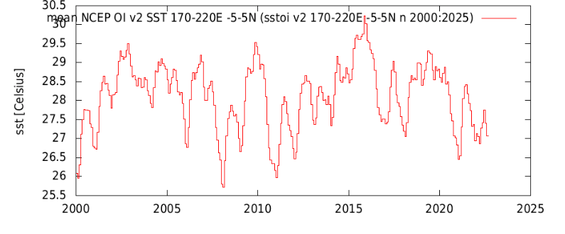 Conditions in the Nino34 region now are close to what existed in 2009 ahead of the weak 2010/11 El Nino. It is reasonable to expect a weak El Nino in 2023. The 11 to 12 year cycle in this temperature that lags sunspots by 31 months is close to its minimum now. So any El Nino in the next year or so will be similar time of the cycle to 2010 rather than 2016 and 1998.