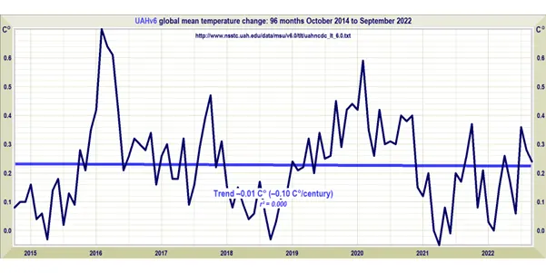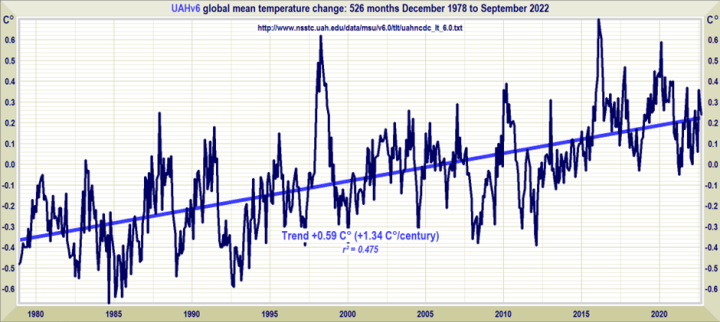The trend on the entire dataset during the 526 months from December 1978 to September 2022 is 0.59 C°, equivalent to only 1.34 C°/century. So slow a rate of warming is well within the natural variability of the climate, and is proving net-beneficial.