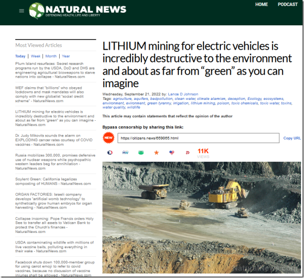 Electric vehicles are promoted as the solution for combating “climate change.” Governments are currently incentivizing the production of electric vehicles, while punishing the fossil fuel industry. However, lithium mining for electric vehicles is incredibly destructive to the environment, and is about as far from “green” as one could imagine. Not to mention, most of the lithium-ion batteries produced today come from China and require water-intensive mining operations that ravage natural environments throughout Australia, Argentina and Chile. The process depletes ground water, and leaves behind toxic wastewater that contaminates fields and harms wildlife. The mining process is not carbon dioxide free, either. The mining process releases 15,000 kilograms of carbon dioxide emissions for every ton of lithium that is extracted.