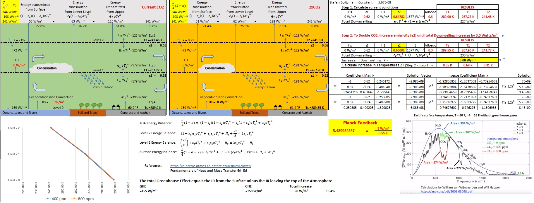 At 2xCO2, the Greenhouse effect will increase by 3W/m² (Dr Happer). This will force the surface to radiate an additional 3 w/m² and the surface temperature will increase 0.55°C. The Planck Response is 5.49 (w/m²)/K