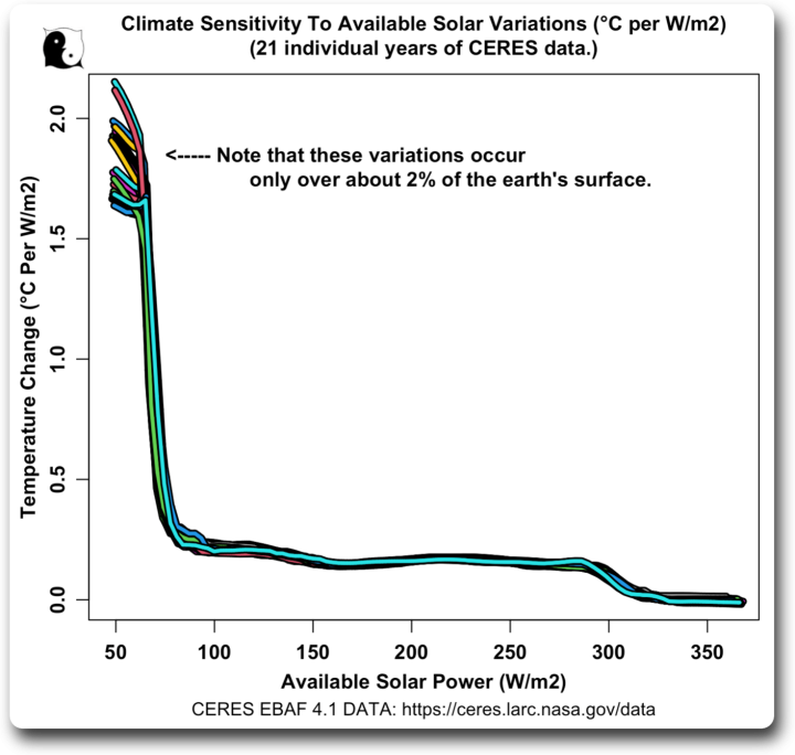 Also, I’ve looked at the same analysis using Berkeley Earth temperature data and CERES radiation data. It shows the same thing you see above—very sensitive where there’s little sun, ~ 0.16 °C per W/m2 over ~70% of the earth, and 0.0 °C over ~22% of the earth.