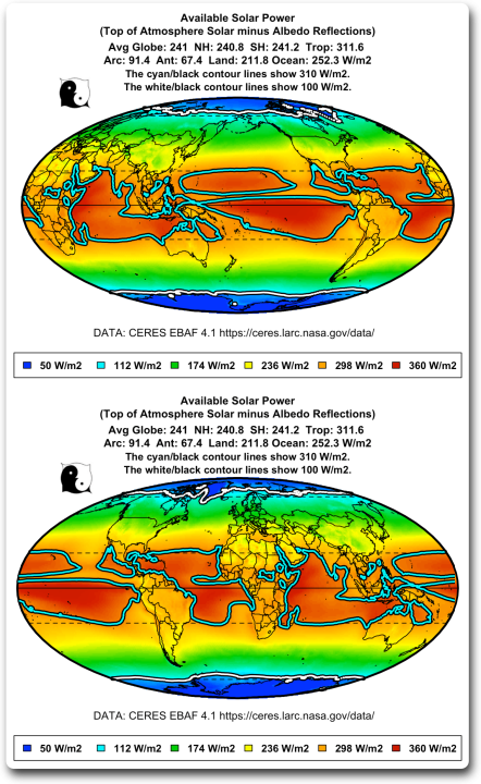 Figure 2. Available solar power (TOA solar minus albedo reflections), Pacific-centered and Greenwich-centered views. Areas in red outlined in cyan/black do not change temperature with increased average solar input. Polar areas in blue outlined in white/black show where the temperature is very sensitive to increased solar input. Dotted horizontal lines show the tropics and the arctic/antarctic circles.