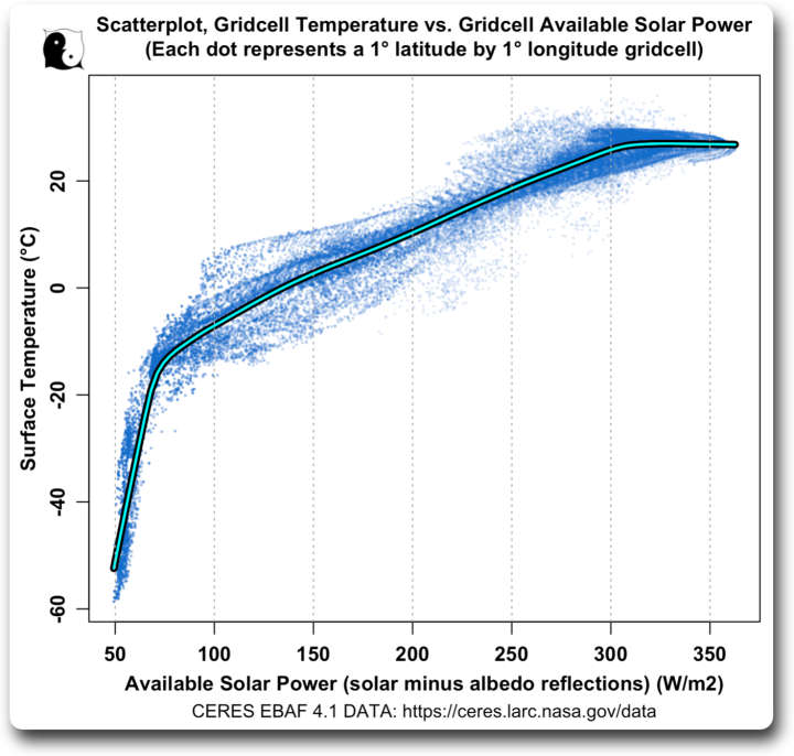 The left side of the plot, below around 100 W/m2 available solar, shows the areas near the poles where there’s little available solar power. In those areas, the temperature rises very quickly with increasing solar power.