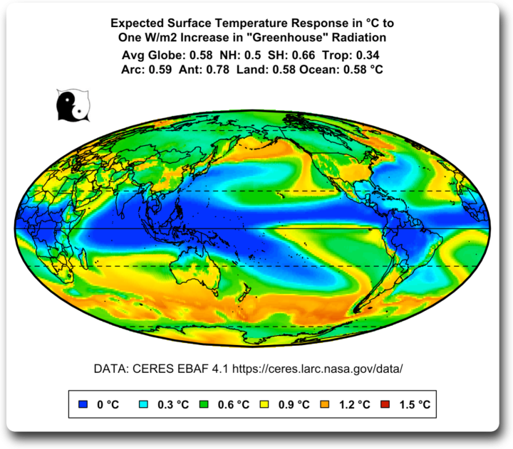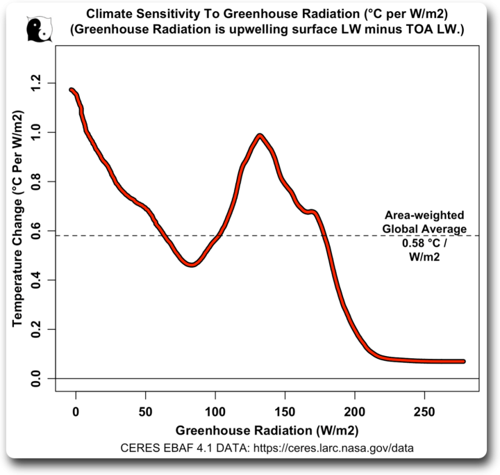This has both similarities and differences from the warming due to changes in available solar shown in Figure 3 above. Both start out high on the left, and both end up with a low unchanging slope on the right. However, the greenhouse warming is much larger in the middle. This leads to a global area-weighted average climate sensitivity of 0.58°C per 1 W/m2 additional greenhouse radiation.