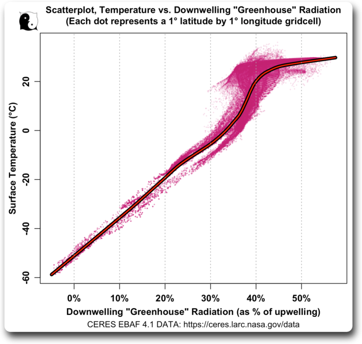 Figure 4. Scatterplot, gridcell-by-gridcell surface temperature versus greenhouse radiation percentage. Number of gridcells = 64,800. The red/black line shows the LOWESS smooth of the data. The cyan/black line’s slope shows the change in temperature for each 1 W/m2 change in available solar. The few negative gridcells are at the poles, and they show the effect of the importation of heat from the tropics.