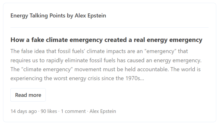 “Energy Talking Points by Alex Epstein” is my free Substack newsletter designed to give as many people as possible access to concise, powerful, well-referenced talking points on the latest energy, environmental, and climate issues from a pro-human, pro-energy perspective.