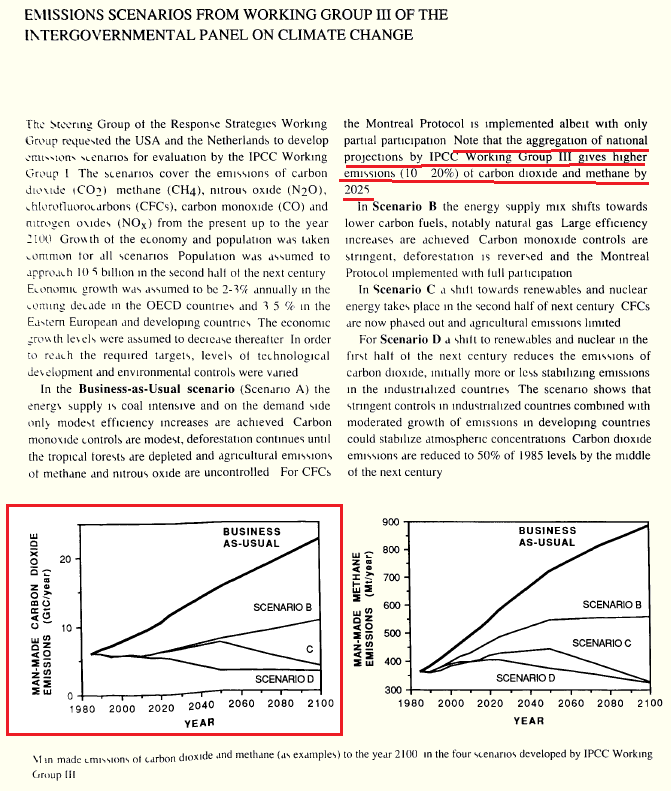 “In the Business-as-Usual Scenario (Scenario A) the energy supply is coal-intensive and, on the demand side, only modest efficiency increases are achieved. Carbon monoxide controls are modest, deforestation continues until the tropical forests are depleted and agricultural emissions of methane and nitrous oxide are uncontrolled. For chlorofluorocarbons, the Montreal Protocol is implemented, albeit with only partial participation. Note that the aggregation of national projections by IPCC Working Group III gives higher emissions (10-20%) of carbon dioxide and methane by 2025.”