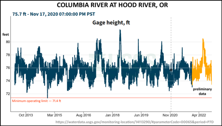 There is some variability but no downward trend is present over the decade reported. The Columbia at the Hood has a Minimum Operating Limit, set at 71.4 feet, to keep the dams operating downstream. It has only touched that limit once in a decade. At that point, the streamflow is given as 140,000 cfs (cubic feet per second). At Quincy, Oregon, near the mouth of the Columbia, the stream flow is 254,000 cfs. [ source ] Those massive streamflows are why it is called “The Mighty Columbia”.