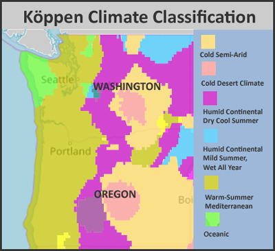 What kind of climate is expected? The Köppen Climate Classification map for the Northwest shows that much of Washington and Oregon is dry-ish — classified as “Cold Semi-Arid”, “Cold Desert”, “Warm-Summer Mediterranean” and “Humid Continental – Dry Cool Summer”. The Cascades, subject of this essay, are generally in the purple stripe up the middle, classified as Humid Continental, Dry Cool Summer.