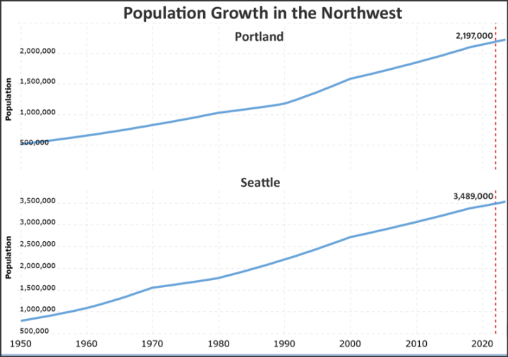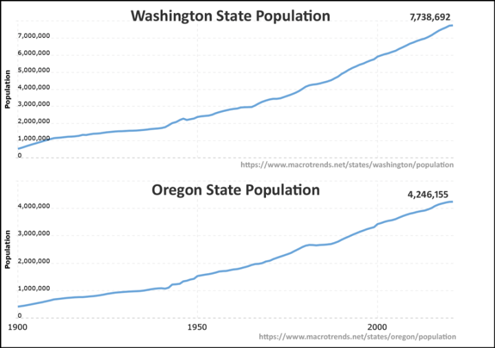 And water demand? Both Oregon and Washington are agricultural states (outside of the cities of course). The two major cities have increased their population, since 1950, four- and five-fold: