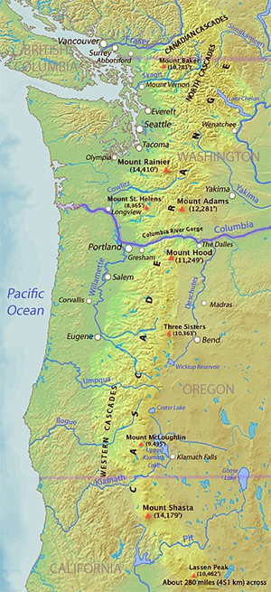 First: What and where are the Cascades? The map above shows the Cascades stretching from Mount Shasta in California, all the way north to the Canadian border (and beyond). Here’s a view some of the peaks:
