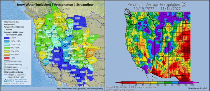 In the USDA, Natural Resources Conservation Service map, up to 17 November 2022 (within a day or so of publication of this essay) the answer is “NO, stream flows are mostly normal or above.” Anything Green (90 to 100%) or any shade of Blue (110% – over 150%) is at or over the long-term average. There are a couple of regions a little low – Yellows – but even most of those are near 90%. The right-hand map from the Western Regional Climate Center (WRCC) shows the most recent monthly precipitation data – again, mostly Normal and Above Normal for Washington and Oregon.