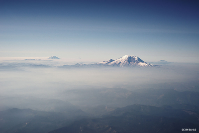 In the foreground is “Mount Rainier, the range’s highest mountain, standing at 14,411 ft (4,392 m). Seen in the background (left to right) are Mount Adams, Mount Hood, and Mount St. Helens.” (image and quote – Wiki)