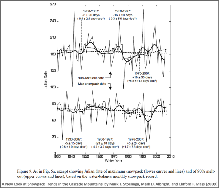 Let’s look at “A New Look at Snowpack Trends in the Cascade Mountains” by Mark T. Stoelinga, Mark D. Albright, and Clifford F. Mass (2009). It’s a little old, but we are looking at the historical record: