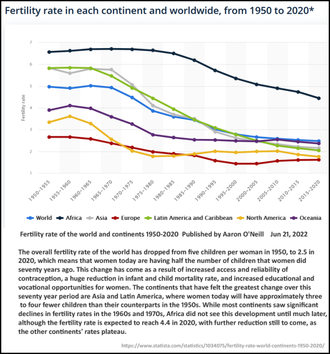 Interestingly, looking just at the North America trace (amber), we might see the effect of the Zero Population Growth movement (Paul Erlich and crowd) which gained traction in the late-1960s which may have suppressed fertility rates into the 1980s when it began to rebound a bit to “2”. The replacement rate in developed countries is consider to be 2.1.