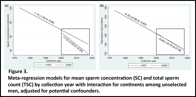 “This comprehensive meta-regression analysis reports a significant decline in sperm counts (as measured by SC and TSC) between 1973 and 2011, driven by a 50–60% decline among men unselected by fertility from North America, Europe, Australia and New Zealand. Because of the significant public health implications of these results, research on the causes of this continuing decline is urgently needed.”