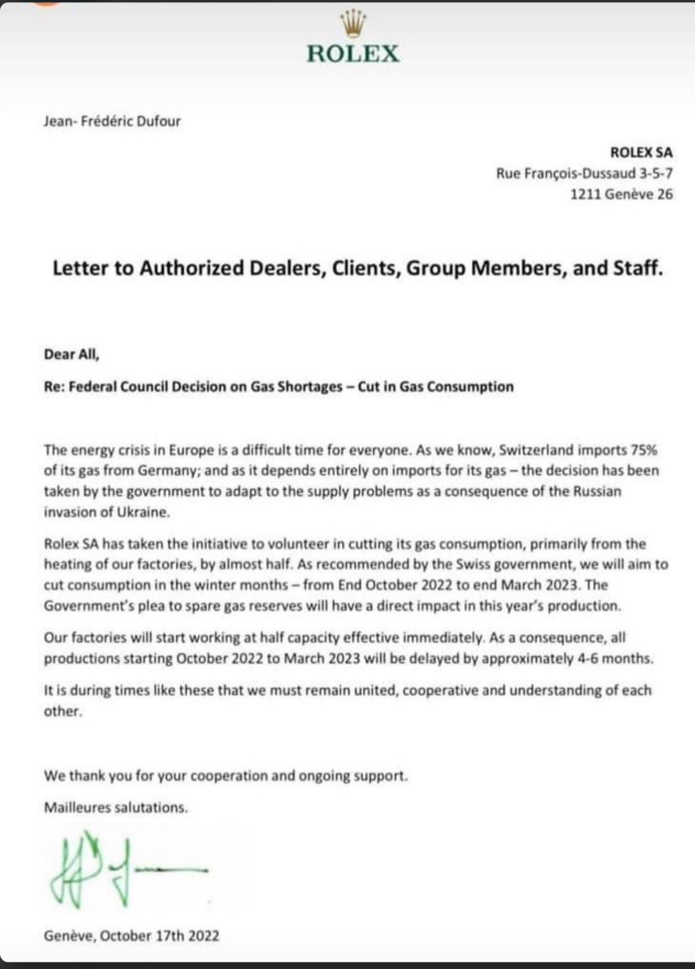 Forget bitcoin…What about my new ROLEX WATCH! — European energy debacle — ROLEX manufacturing cut by 50%…The global elite will need to wait even longer now for their new Oyster Perpetual….