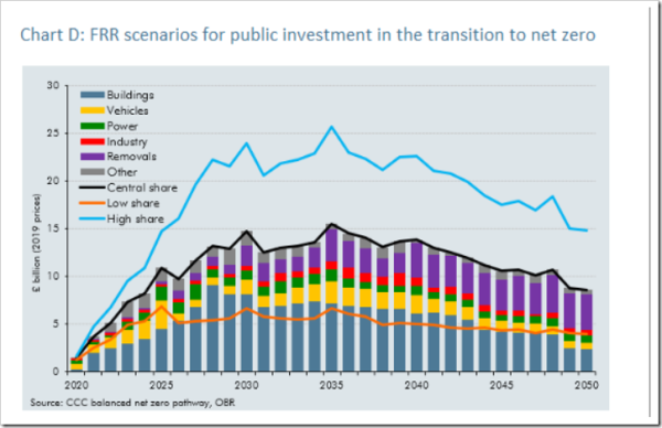 Over the full period of 2020 to 2050, the total public spend on Net Zero is as high as £573.1 bn. The Low /High Share scenarios simply reflect what proportion of the cost the government will pay as opposed to the public. It does not alter what we will have to pay in total terms, whether via tax or private spending.