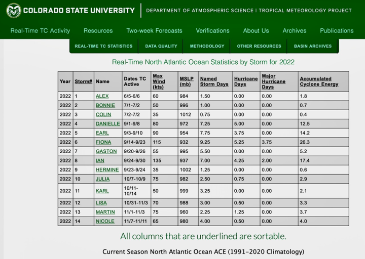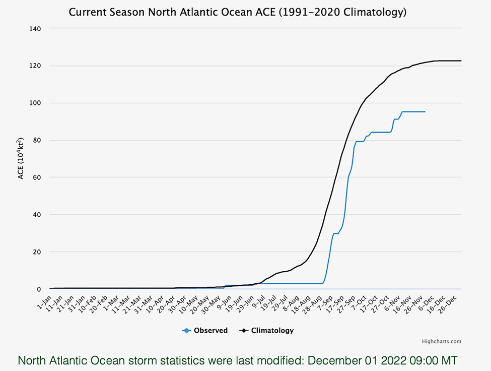 The Colorado State University graph below shows the year 2022 Atlantic Hurricane season below average ACE outcome compared to 30-year climate average period between 1991-2020.