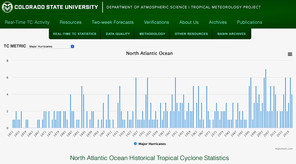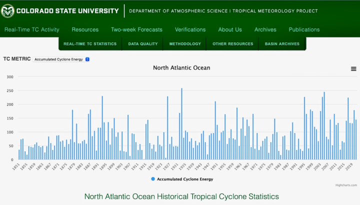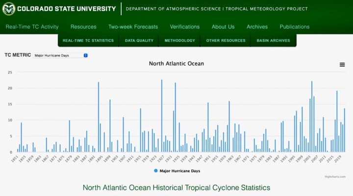 Colorado State University data for the long term North Atlantic history providing complete records of major hurricanes, major hurricane days and total ACE are shown below.