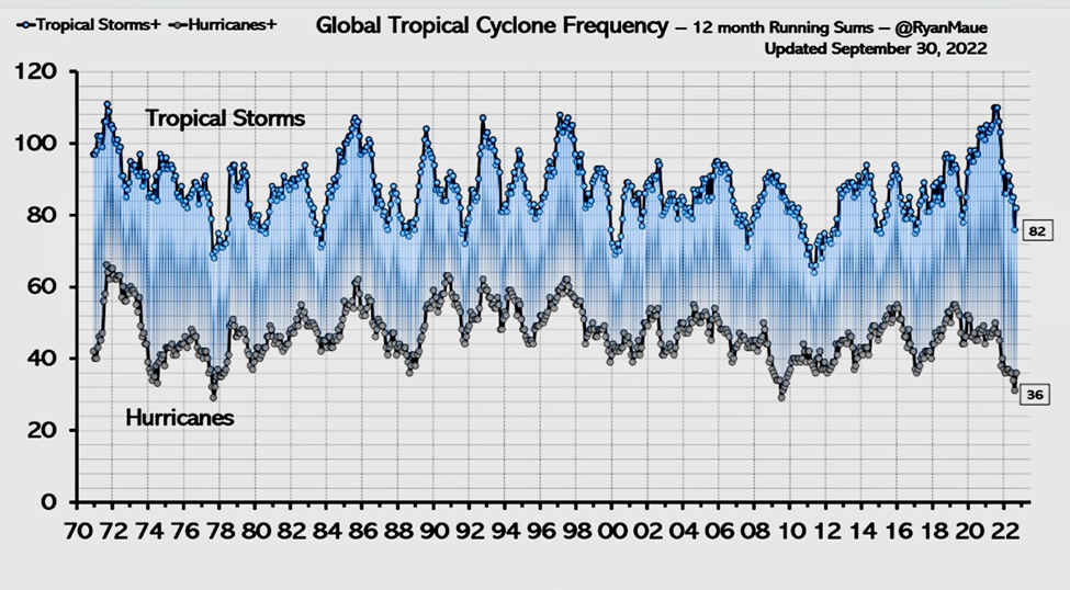 Additional scientific assessments of ACE data shown below clearly establish that there are no recent climate change driven increases in tropical storms, hurricanes or major hurricanes with these outcomes demonstrating natural climate behavior is driving these outcome patterns.